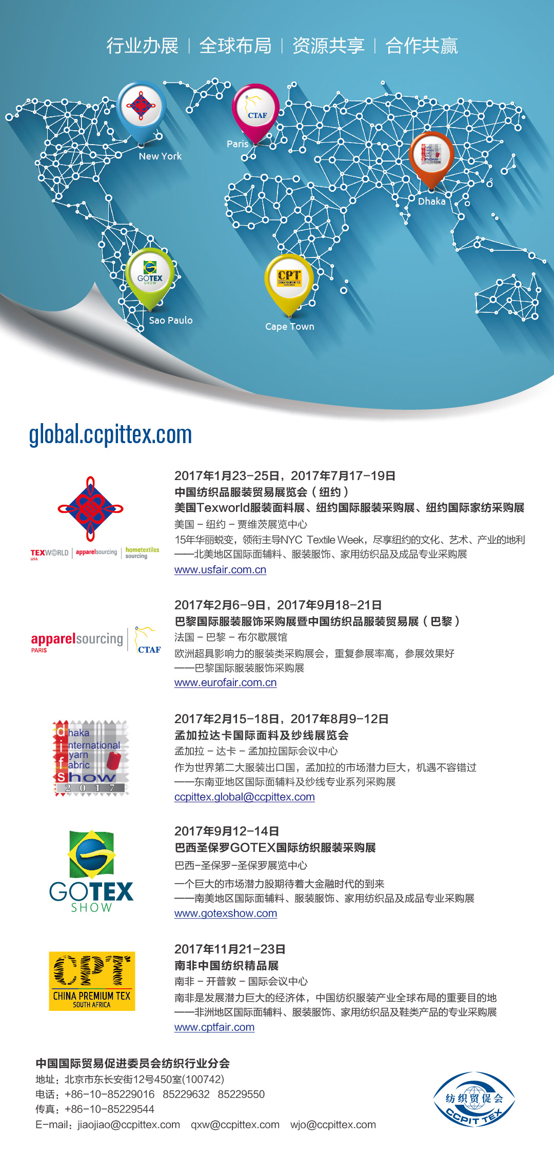 2017中国纺织品服装贸易展览会(巴黎)秋季展暨巴黎国际服装服饰采购展(CTAF/APP Paris)将于9月18-21日在巴黎布尔歇展览中心举办。