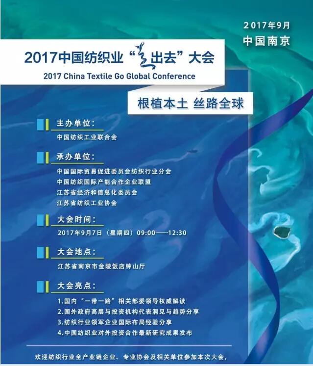 根植本土 丝路全球--- 2017中国纺织业"走出去"大会将于9月在江苏南京召开