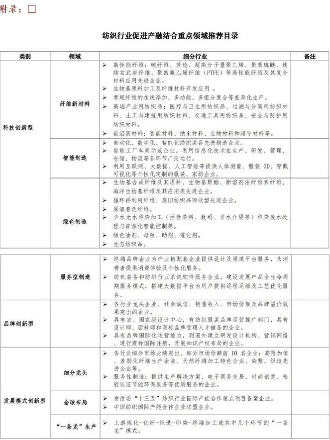 推动纺织行业上市公司以及龙头企业开展以高端技术、高端人才和高端品牌为重点的跨境并购,进行原料、产业链和市场的跨国布局。鼓励引入顶尖技术、管理团队、商业模式、营销渠道等资源,形成一批技术含量高、发展质量好、产业带动强的全球纺织行业龙头企业。大力支持上市公司或行业并购基金牵头,开展对纺织产业升级有重要战略意义的境外项目并购,打造中国纺织业的全球快速反应制造基地模式,维持和提升中国纺织工业在全球供应链中的国际领先优势。