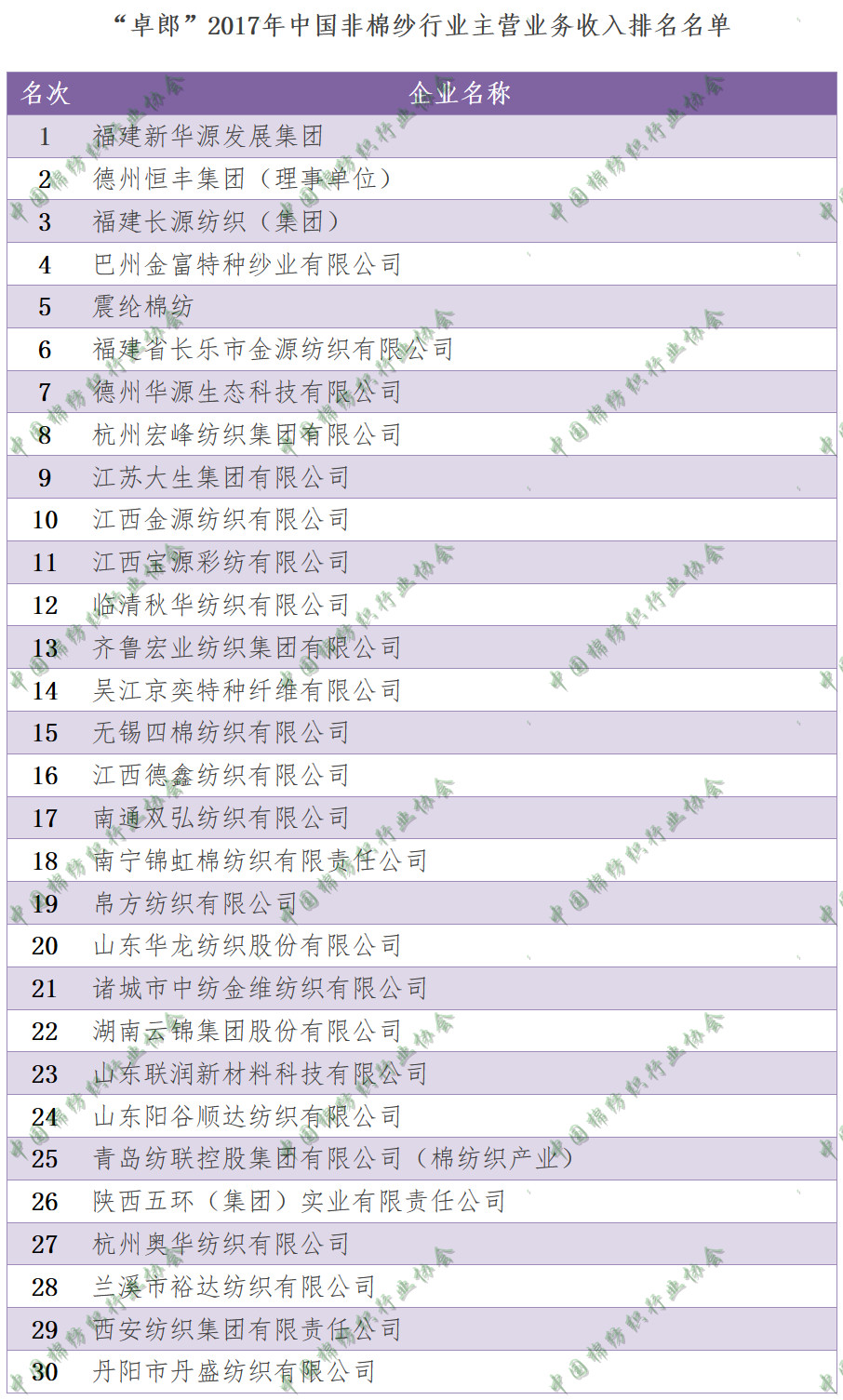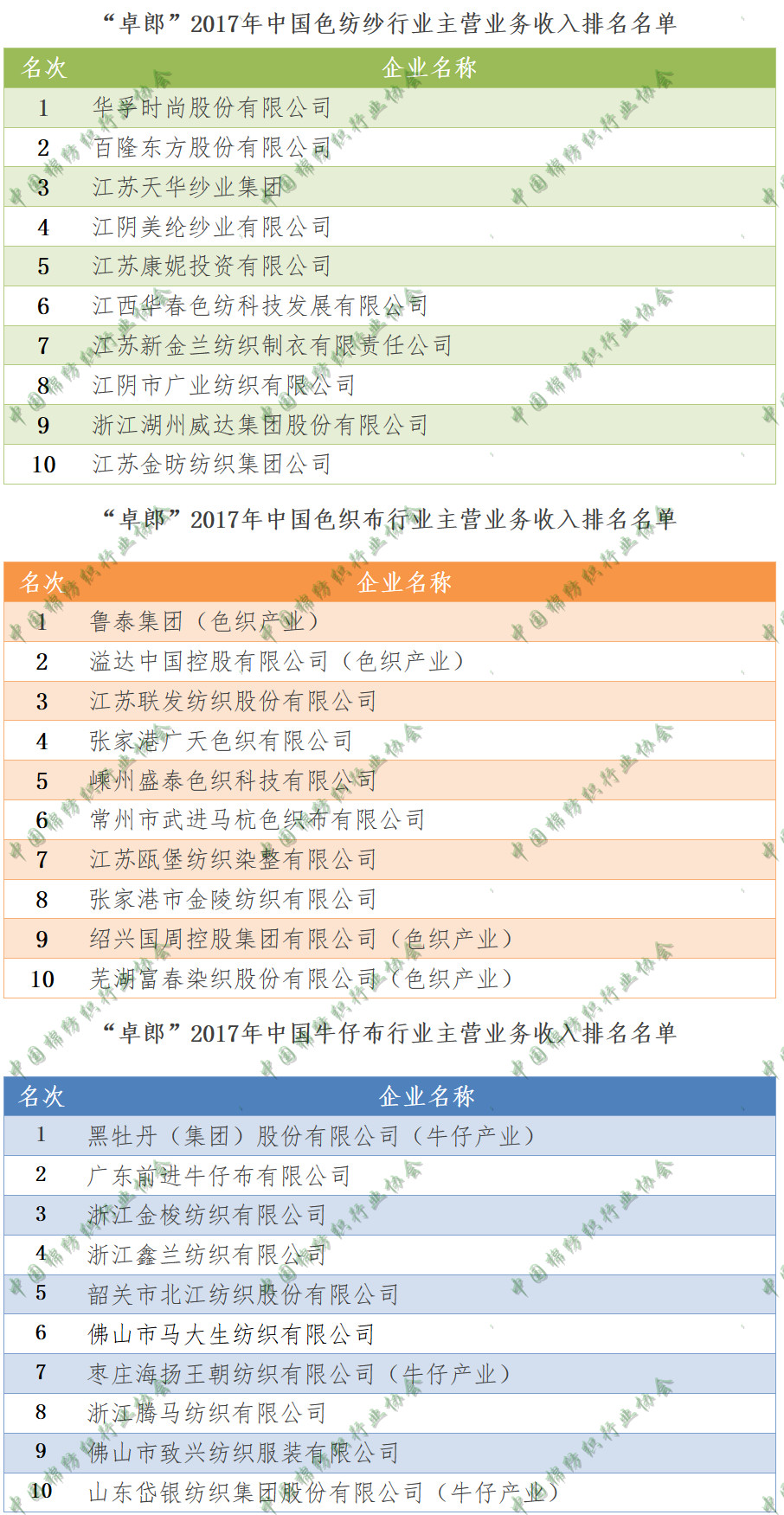 您现在的位置是:首页 > 要闻 2017年中国棉纺织行业分类产品(非棉纱、色纺纱、色织布、牛仔布)主营业务收入排行榜发布 来源:中国纺织 发布日期:2018-04-20 字体: 【小】 【中】 【大】 近日,在中国棉纺织行业协会发布的“2017年中国棉纺织行业主营业务收入排名结果”中,同时按照分类产品的主营业务收入分别排出“非棉纱(棉混纺纱及化纤短纤纱)行业前30名”、“色纺纱行业前10名”、“色织布行业前10名”、“牛仔布行业前10名”企业(具体名单见附件)。 分类排名主要依据棉纺织企业该类产品的生产性销售收入,参加分类排名企业只能选择其中一类,其主导产品产量应占总产量比重的20%以上。 分享: 热门文章: 2025intertextile春夏 | “友礼”同享齐观展... [2025-02-19] 2024年我国纺织行业经济运行总体平稳 [2025-02-17] 聚焦绿色智慧融合 展示产业用纺织品新趋势 [2025-02-11] 响应政策 落实服务 | PH Value义乌展全力“备战”中 [2025-02-11] 【亮星季】第一期正式开启 | 商贸先行,品质好礼享不停 [2025-02-10] 展会直通车