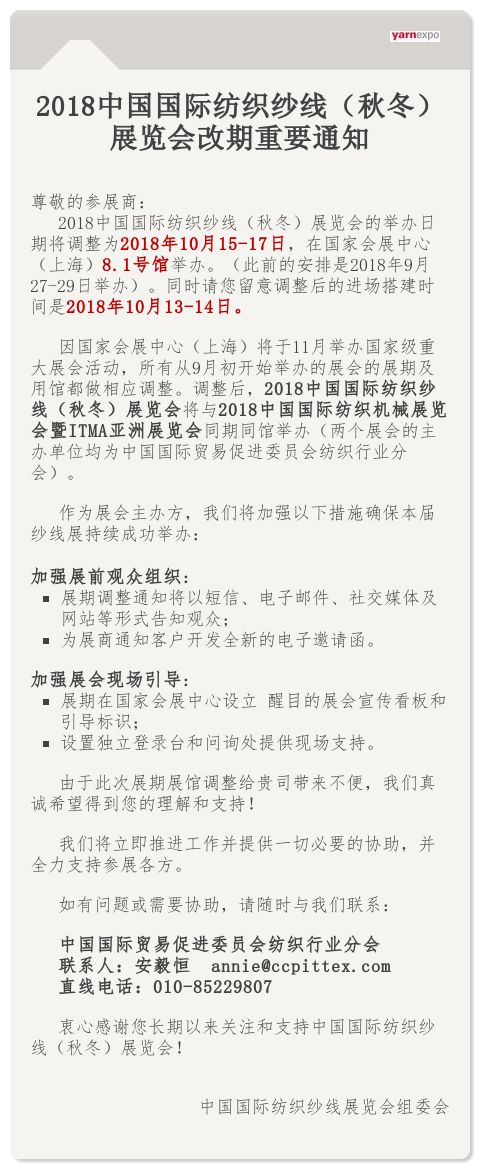 【重要通知】 2018中国国际纺织纱线(秋冬)展览会举办日期调整为2018年10月15-17日