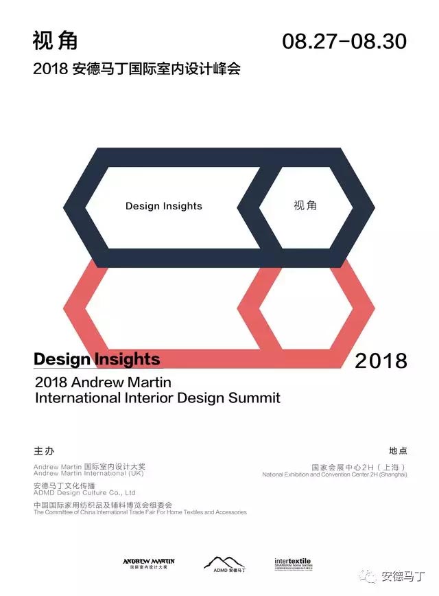 2018 安德马丁国际室内设计峰会将于8月27日至30日在上海国家会展中心举行。峰会将以“视角”为主题,由“视角”主题论坛,“无界之合”跨界家居艺术展两部分组成。届时,峰会将邀请众多海内外顶尖设计师、艺术家、行业精英,齐聚上海,从多元的领域和角度,以设计之名展开一系列沟通交流。本次峰会由 Andrew Martin International (UK)、安德马丁文化传播和中国国际家用纺织品及辅料博览会组委会联合主办。