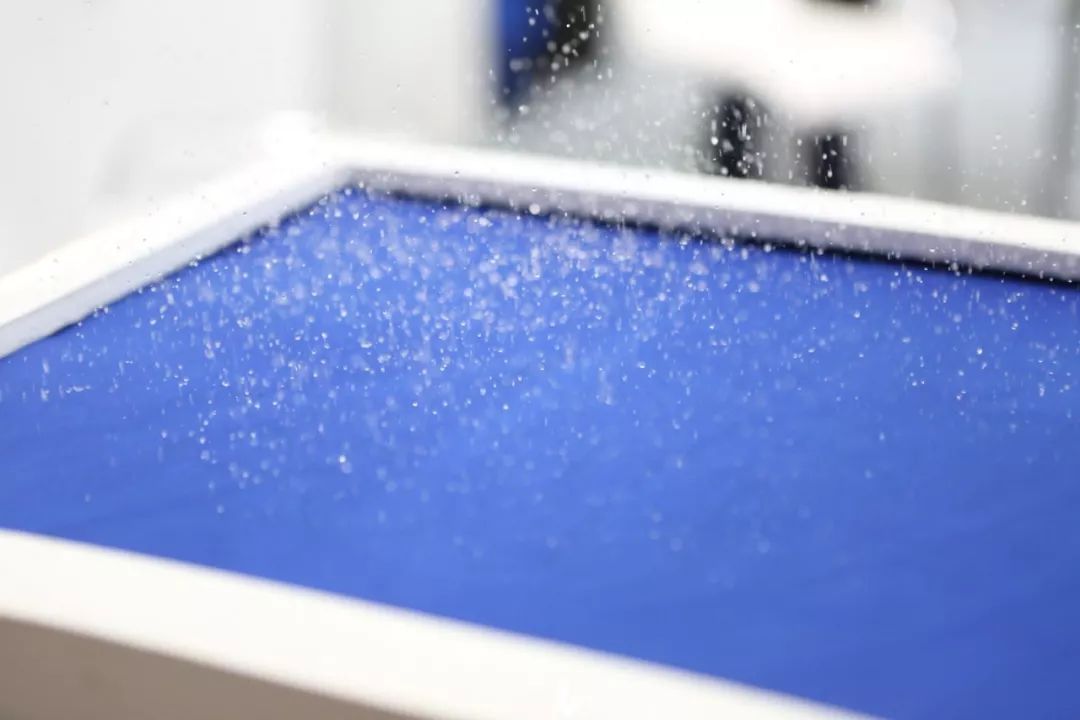 在遍地都是优质产品的intertextile秋冬面辅料展上,要想第一时间获得关注,不仅东西要好,更要抓人眼球。开展进入第二天,展会上的很多新奇特就已刷爆“朋友圈”。扒开围观人群看到,原来大家抢着拍视频发朋友圈的是这些在面料上跳动的水珠!这种奇特的展示方式来自传化化工,作为一家助剂企业,在使用了无氟防水剂的面料上倒上水,通过特殊装置让水珠随着音乐跳跃??这样的防水演示又有料又有趣,吸引了众多观众驻足观赏。