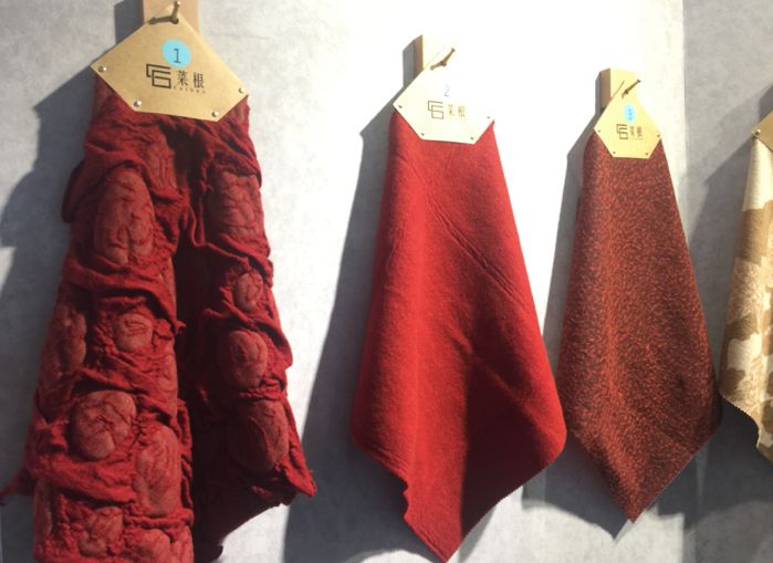 越来越多服装产品、身着成衣的模特出现在intertextile秋冬面辅料展的现场已是一大趋势,中间产品成品化展示是越来越多位于产业链上游企业的共识。单单展示一两款产品已经不够,在广东菜根的展位上,不同系列的面料产品被分区展示服装成衣效果。这些服装出自菜根与其合作的设计师之手,一目了然每组面料做成时装的样子。多种工艺的拼接、明暗相间的暗纹。