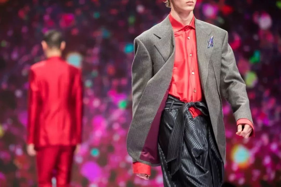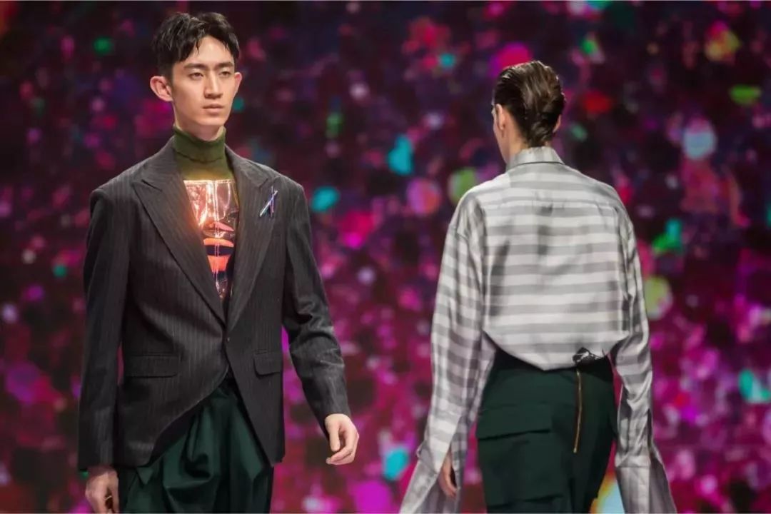 王玉涛擅长将精湛的传统手工艺同现代工业文明相结合,通过创新倡导高品质文化追求和生活方式,他亲自操刀了本次大秀的所有秀服。男装采用凌厉的剪裁和很有戏剧张力的廓形、体现制造业创造力下的硬朗与工业感。女装则运用了玫粉、亮黄、朱红、闪银、松绿等高纯度色彩制造视觉惊喜,用中度灰做调和、配以点点炫光色,如梦如幻。