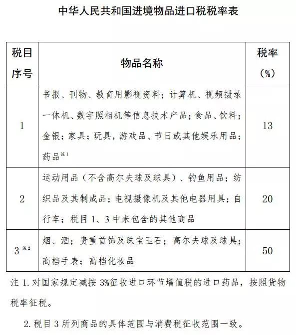 据财政部网站消息,经国务院批准,国务院关税税则委员会决定对进境物品进口税进行调整。将进境物品进口税税目1、2的税率分别调降为13%、20%。将税目1“药品”注释修改为“对国家规定减按3%征收进口环节增值税的进口药品,按照货物税率征税”。此次关税税率调整,意味着包括药品、刊物、教育用影视资料、计算机以及家具、玩具、游戏品等进口税税率降至13%,运动用品(不含高尔夫球及球具)、钓鱼用品;纺织品及其制成品、电视摄像机及其他电器用具、自行车等税率降至20%。上述调整自2019年4月9日起实施。