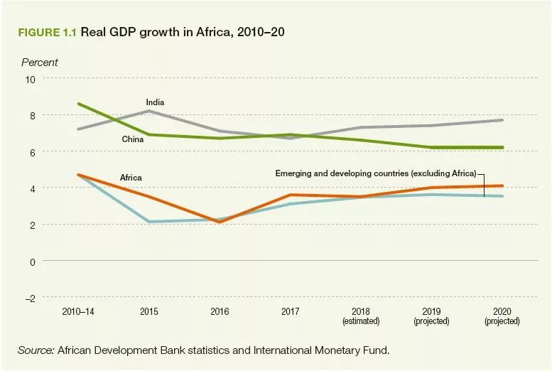 非洲大陆2018年GDP平均增长率3.5%,与2017年持平,比2016年提高1.4%。非洲的GDP增长期望虽然不如中国和印度高企,但是仍领先于其他在新兴和发展经济体中。