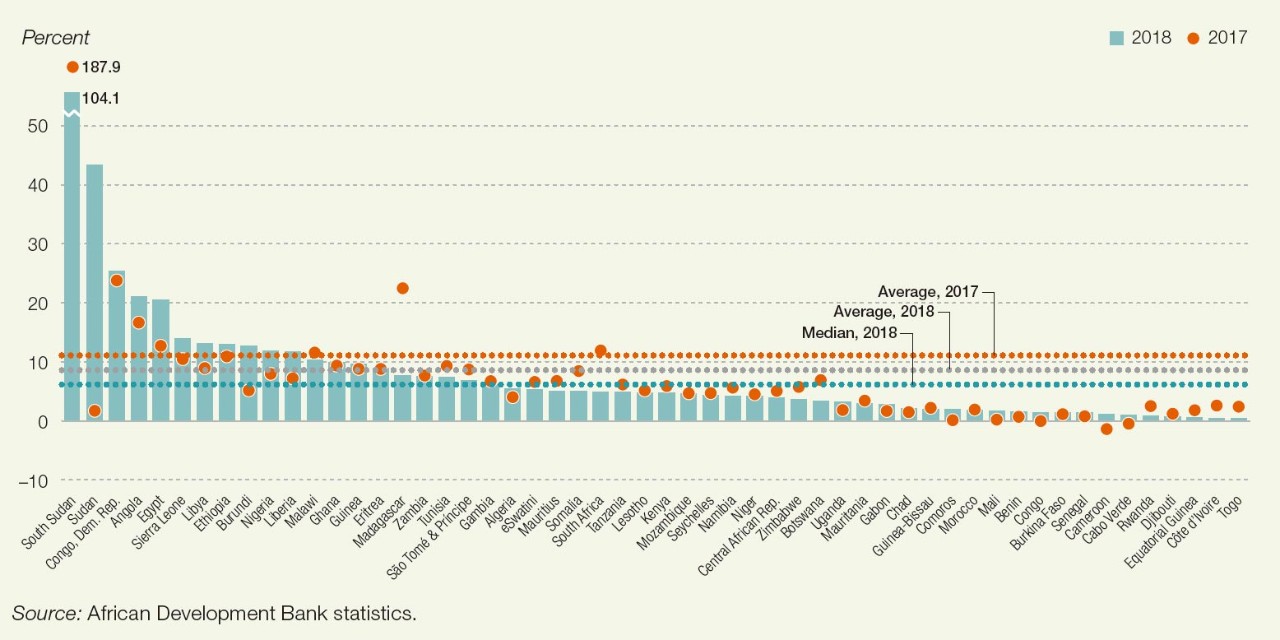 非洲各国的平均通胀率从2017年的12.6%降低到2018年的10.9%,预计在2020年降到8.1%。超过10%的通胀率通常发生在被冲突或者战乱影响的国家,以及非货币联盟国家。比如在南苏丹,通胀率达到188%;而通过表格能看出由于中非经济货币联盟、西非经济货币联盟尤其是CFA联盟与欧元区挂钩,这些成员国的通胀率最低,一般在2%以下。