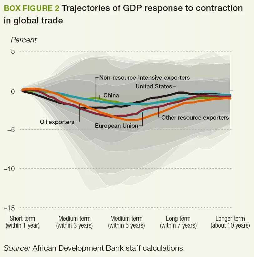 下面的经济模型以脉冲图形式显示了世界贸易规模收缩对非洲经济体的影响,取决于各经济体外贸出口的本质和繁荣程度。