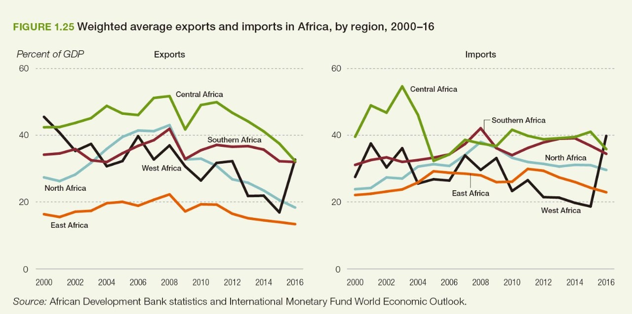 最近几年内非洲进出口情况的的趋势变动也是由非洲地区进出口需求的不一致性决定的。比如,北非地区旅游收入的减少(安全问题日益引起关注),西非和中非地区原材料价格的下降都是导致这几个地区出口波动的原因。在中非地区,出口额占GDP贡献率从2011年至2016年降低了15个百分点,主要是由于外部需求减少以及这些地区国家高涨的通货膨胀导致的货币贬值引起的。2010年之后非洲大多数国家的出口占GDP比例都大幅降低(南非由于出口产品的多样性而不在此列);进口展GDP比例的表现在东非有所下降,但是在中非和北非持续增强。
