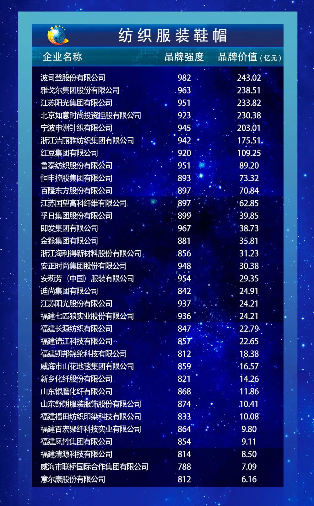 纺织服装行业内,波司登、雅戈尔等33家企业荣登纺织服装鞋帽类品牌榜。