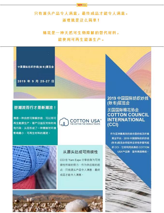 美国国际棉花协会(CCI)作为全球非营利机构,致力以COTTON USATM品牌推广美国棉花。在即将举办的2019中国国际纺织纱线(秋冬)展览会上,CCI将继续分享为可持续性所作的努力以及相关观点,探讨可持续原材料为整个供应链所带来的禆益。
