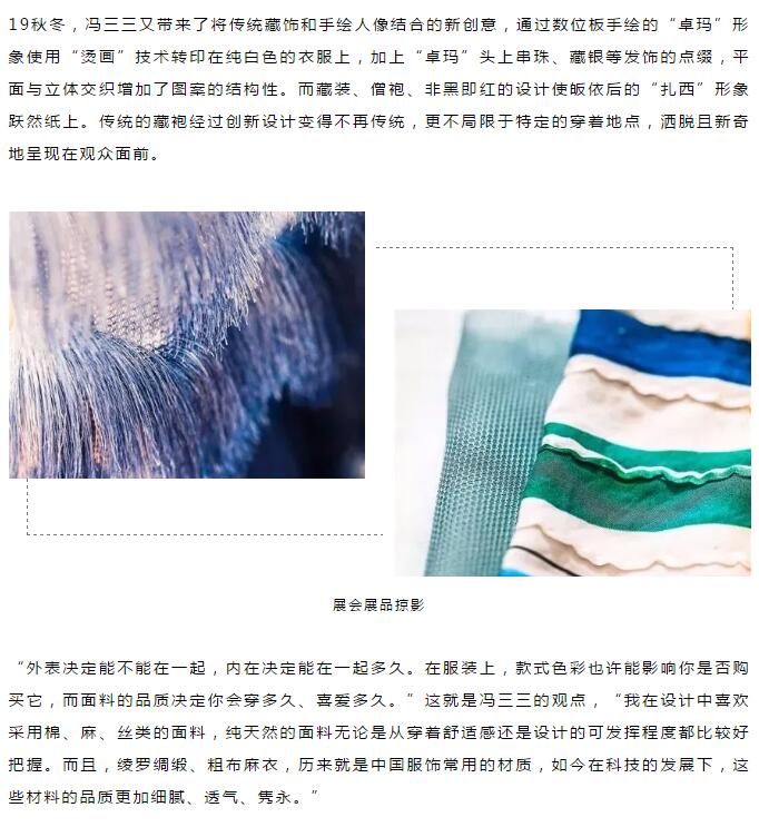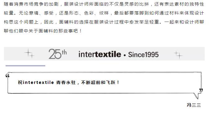 “近年来我在intertextile面辅料展上最大的感受,就是国内面辅料企业已经进入了勤于研发、高速出新的阶段,但在设计和材料上还有一些空间,这也给设计师们与面辅料企业作为彼此助力合作的机会,而intertextile秋冬面辅料展,就是让这个机会发生的地方。在不久的将来,我期待在这个平台上看到设计师品牌与面辅料企业百花齐放的局面,共同将‘最美中国风’推向全世界。 ”冯三三说。