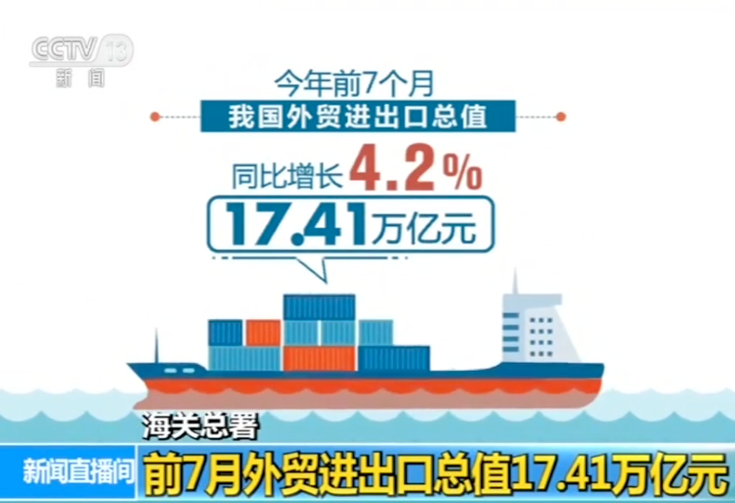 8日上午,海关总署公布今年前7个月我国外贸进出口相关情况,数据显示,前7个月我国外贸进出口总值17.41万亿元人民币。同比增长4.2%。其中,出口9.48万亿元,增长6.7%,进口7.93万亿元,增长1.3%。