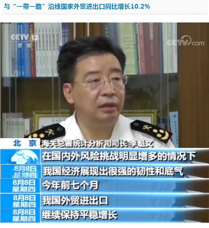 海关总署统计分析司司长 李魁文:前七个月我国与“一带一路”沿线国家的贸易合作潜力持续释放,贸易增速高出同期我国外贸总体增速6个百分点,外贸进出口更趋多元化。