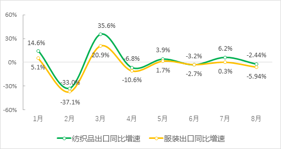 今年1-8月,全国纺织品服装累计出口总额1774.4亿美元,同比下降2.0%(以人民币计同比增长3.65%)。其中,纺织品累计出口额794.0亿美元,同比增长0.96%(以人民币计同比增长6.8%),服装累计出口额980.4亿美元,同比下降4.26%(以人民币计同比增长1.24%)。