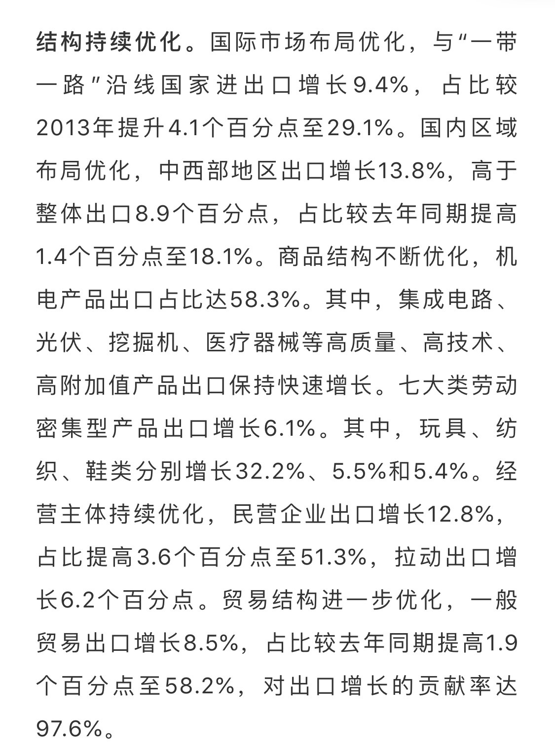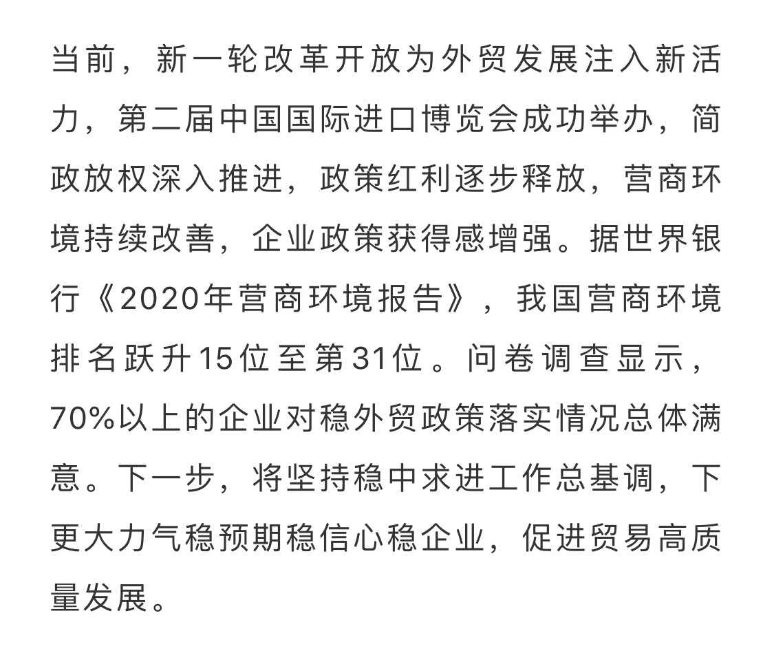 党中央、国务院高度重视外贸工作。10月23日,李克强总理主持召开国务院常务会议,部署进一步做好稳外贸工作,推动进出口稳中提质。面对复杂严峻的外贸发展环境,商务部坚决贯彻党中央、国务院决策部署,扎实做好“稳外贸”工作,大力推动国际市场布局、国内区域布局、商品结构、经营主体和贸易方式等“五个优化”,持续推进外贸转型升级基地、国际营销网络和贸易促进平台等“三项建设”,积极推进贸易高质量发展,各项工作取得积极成效,1-10月外贸发展稳中提质。