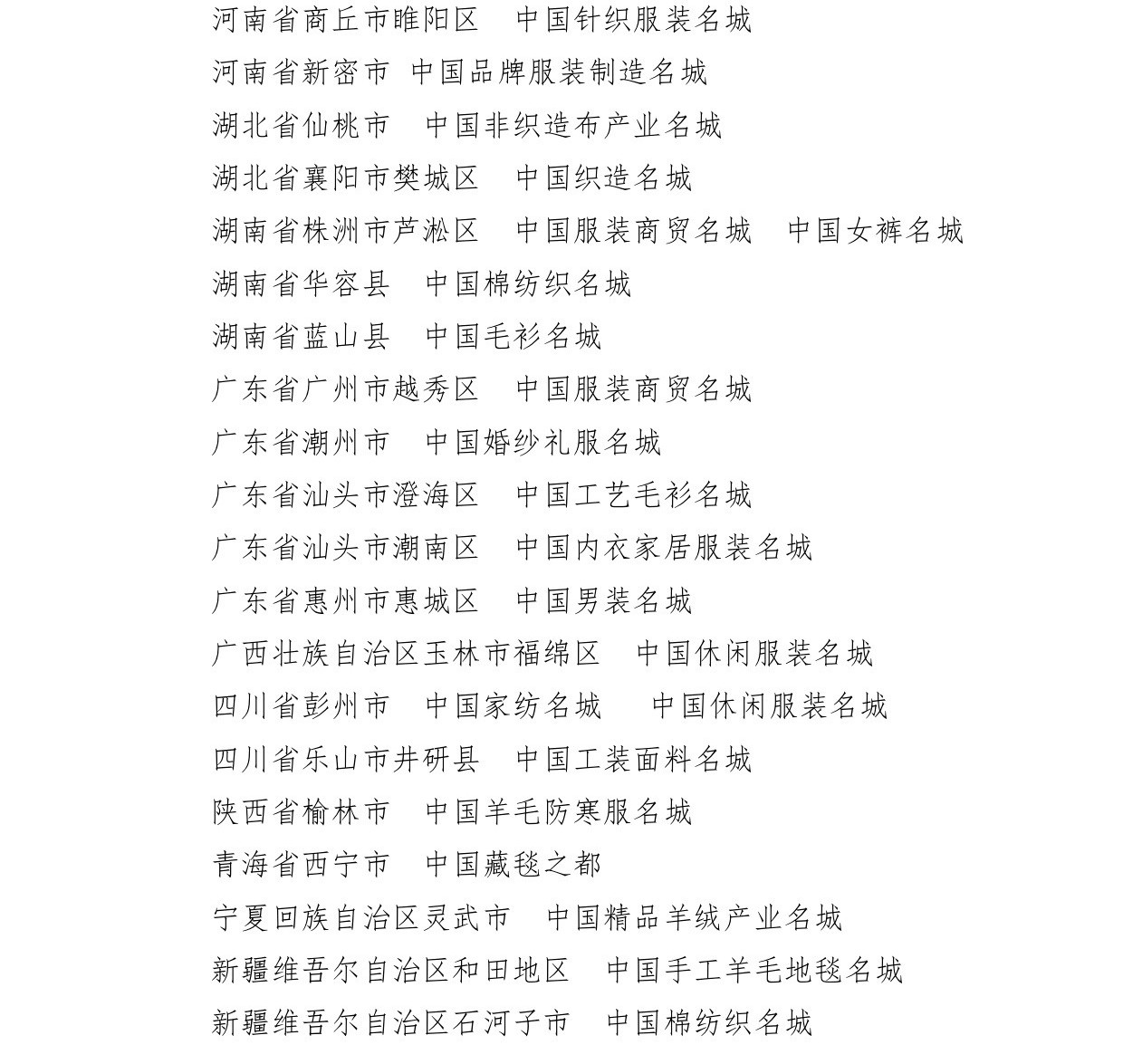 会议还为辽宁省海城市等197个纺织产业集群试点地区授牌。确定山东省昌乐县等七个地区为纺织产业集群试点地区并授牌。颁发“集群地区纺织产业发展服务优秀单位奖”、“纺织产业集群试点工作推动优秀单位奖”。颁发“第八届全国纺织行业管理创新成果奖”。颁发“2019年度十大类纺织创新产品奖”。颁发“2019年度中国纺织工业联合会产品开发贡献奖”。