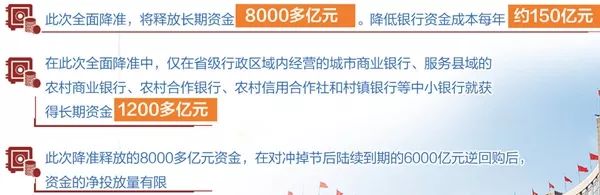 此次全面降准,将释放长期资金8000多亿元。在此次全面降准中,仅在省级行政区域内经营的城市商业银行、服务县域的农村商业银行、农村合作银行、农村信用合作社和村镇银行等中小银行就获得长期资金1200多亿元,有利于增强立足当地、回归本源的中小银行服务小微企业、民营企业的资金实力。