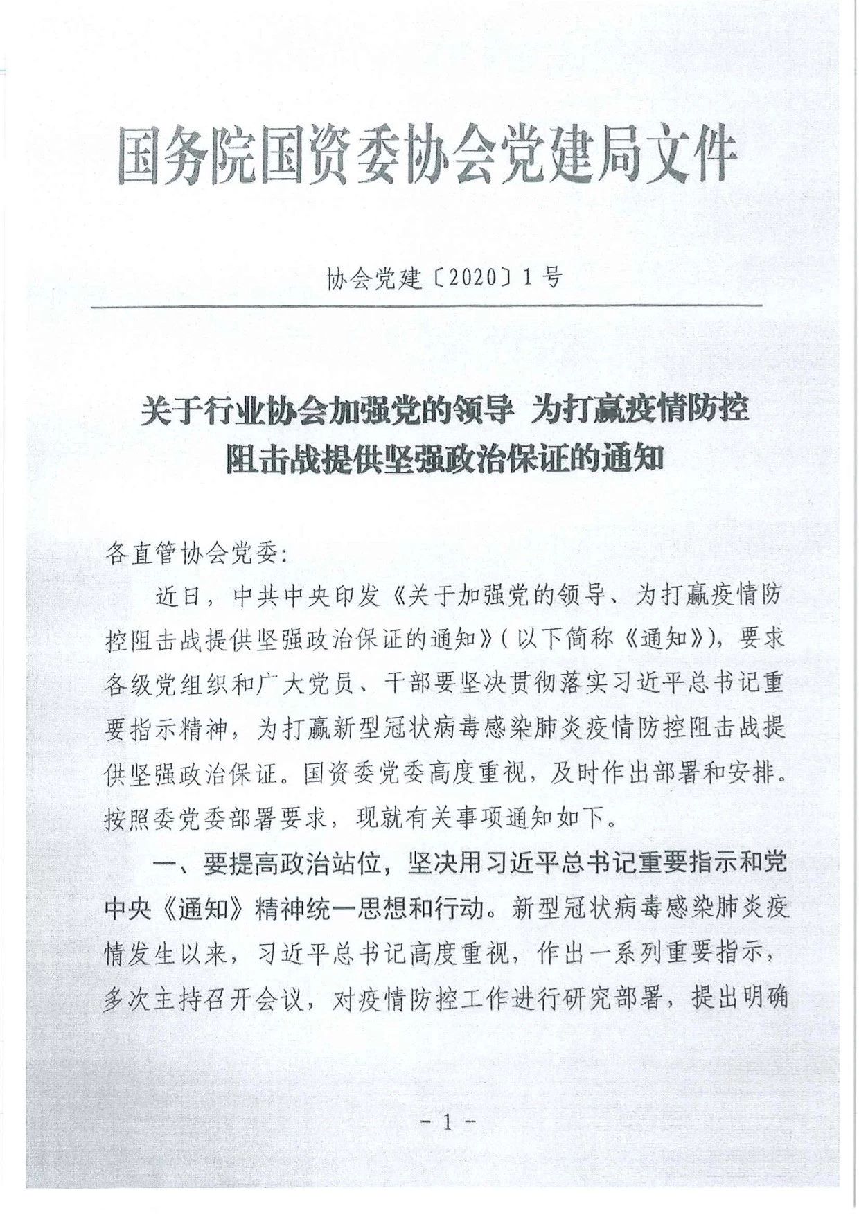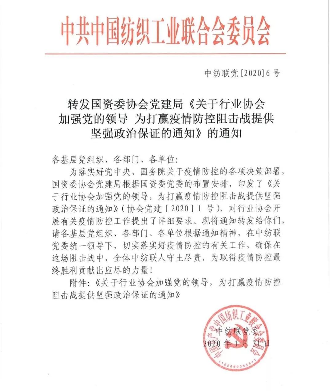 为落实好党中央、国务院关于疫情防控的各项决策部署,国资委协会党建局根据国资委党委的布置安排,印发了《关于行业协会加强党的领导,为打赢疫情防控阻击战提供坚强政治保证的通知》(协会党建[2020]1号),对行业协会开展有关疫情防控工作提出了详细要求。中国纺织工业联合会党委现将通知转发,请各基层党组织、各部门、各单位根据通知精神,在中纺联党委统一领导下,切实落实好疫情防控的有关工作,确保在这场阻击战中,全体中纺联人守土尽责,为取得疫情防控最终胜利贡献出应尽的力量。