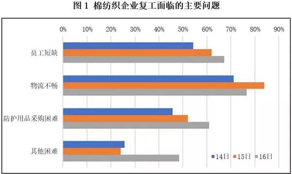 中棉行协专门成立了防控疫情,恢复生产协调小组,并开通了中国棉纺织行业协会在线服务平台收集企业在抗击疫情、恢复生产中遇到的问题和建议。2月16日,共有10家企业(累计25家)反馈,除了图1中列出的问题,棉纺织企业还面临因下游产业链开工不足导致订单不足,而不得部分或暂缓开工;与此同时,随着时间推移,资金链紧张、社保和还贷压力大等金融方面的问题愈加凸显。根据上述问题,中棉行协高度重视,并即时向上级部门汇报,持续贯彻落实中央“突出重点、统筹兼顾、分类指导、分区施策”的防控要求,积极协调与服务好企业疫情防控、复工复产工作。