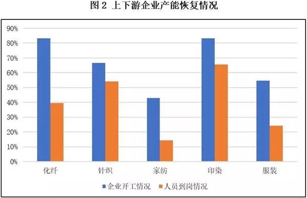 从所调查上下游企业样本看产能恢复情况,各行业复工企业和复工人员占比如图2所示,整体来看,人员到岗情况稍弱于企业开工情况,说明企业正挖掘潜力提高开工率。综合看这两方面数据,上下游产业与棉纺织产业产能恢复情况基本相当;化纤企业开工情况较好,说明原料供应充足;印染行业依旧保持较高活力,在两方面指数均有较高优势。