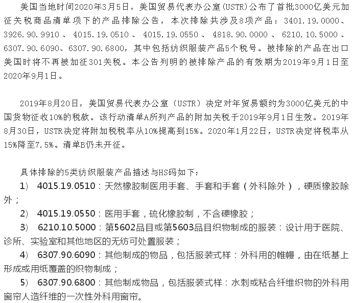 您现在的位置是:首页 > 要闻 含纺织服装5个税号,美国发布3000亿美元征税产品首批排除清单 来源:中国纺织品进出口商会 发布日期:2020-03-10 字体: 【小】 【中】 【大】 分享: 热门文章: 2025intertextile春夏 | “友礼”同享齐观展... [2025-02-19] 2024年我国纺织行业经济运行总体平稳 [2025-02-17] 聚焦绿色智慧融合 展示产业用纺织品新趋势 [2025-02-11] 响应政策 落实服务 | PH Value义乌展全力“备战”中 [2025-02-11] 【亮星季】第一期正式开启 | 商贸先行,品质好礼享不停 [2025-02-10] 展会直通车