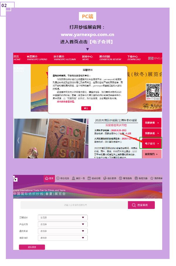 继2020yarnexpo春夏纱线展"参展商名单"、"在线商贸预约"线上功能开通,有展会“小百科”之称的电子会刊也已上线,展商、观众可以随时线上了解相关展品、展商信息,进行"一对一"对接。
