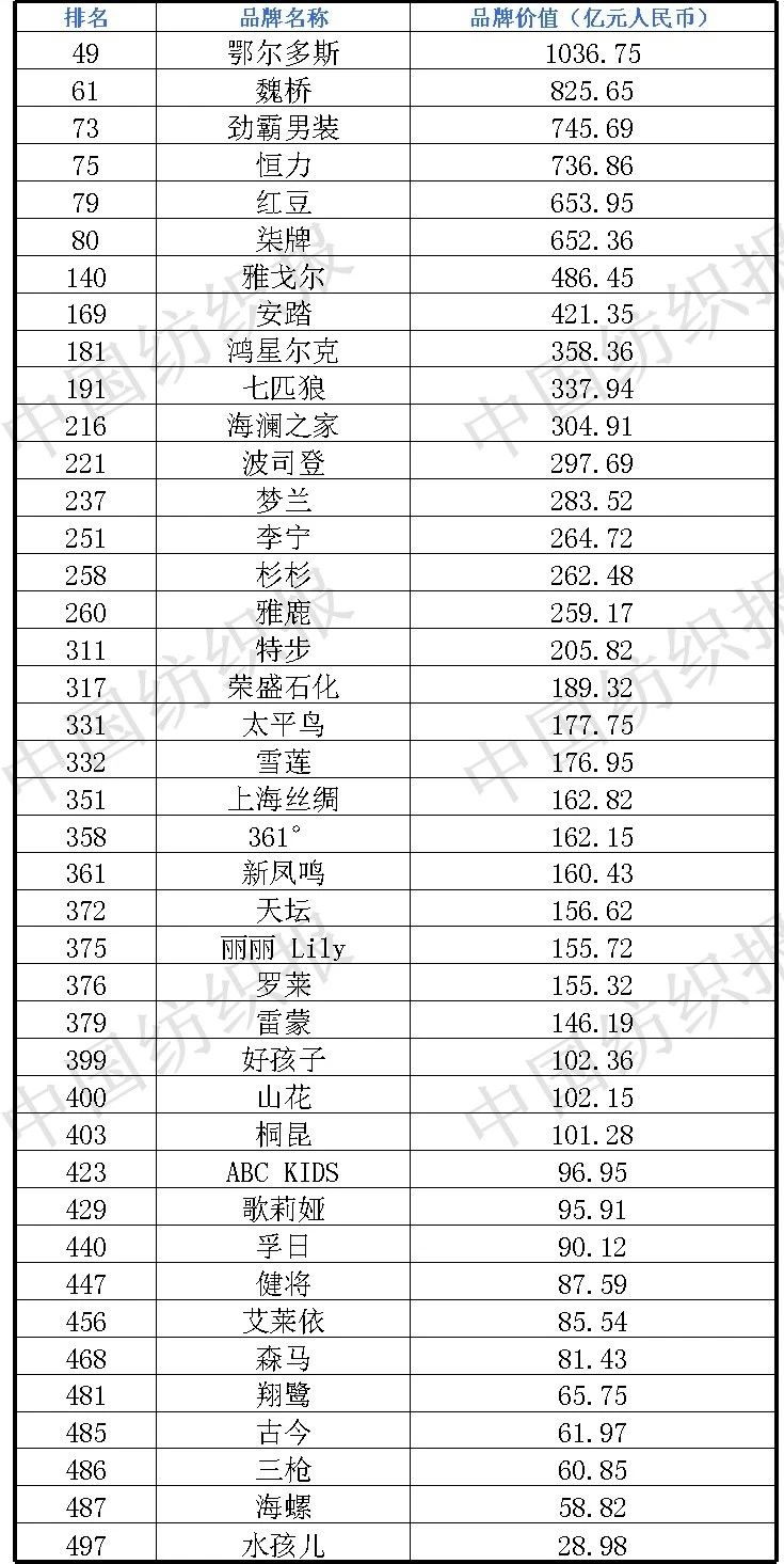 尽管新冠疫情没有阻挡中国品牌价值整体上升的趋势,但是与去年相比,服装、汽车、旅游、媒体等受疫情影响大的行业入榜品牌数量明显下降,而食品饮料、金融、机械等“刚需“行业入榜品牌均有不同程度增加。本年度《中国500最具价值品牌》排行榜中,共有来自食品饮料、轻工业、建材、传媒、纺织服装、医药、机械等在内的27个相关行业的品牌入选。其中,纺织服装行业入选品牌共41个。本年度共有53个中国品牌的价值超过1000亿,比去年增加了6个。