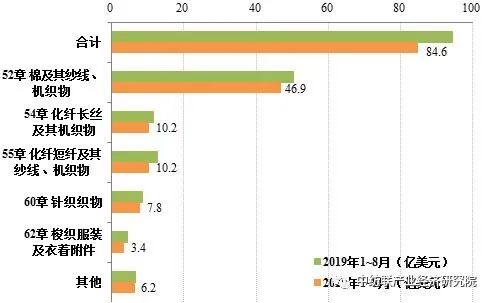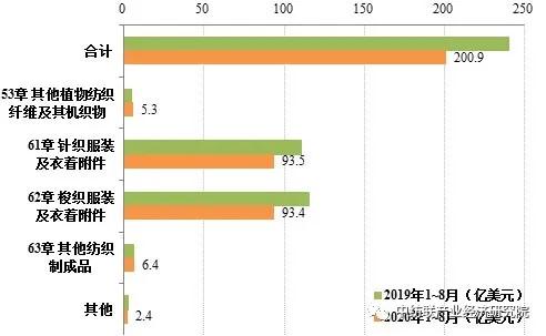 图3:2020年1~8月孟加拉纺织品服装出口主要商品金额及变化情况