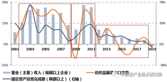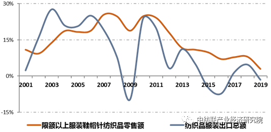 图2:2001~2019年纺织服装产品出口及内销指标同比增长情况