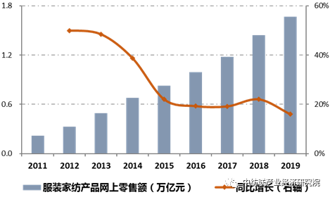 图3:2011~2019年服装家纺产品网上零售额及同比增长情况