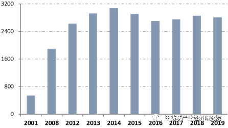 图4:2001~2019年纺织品服装出口总额