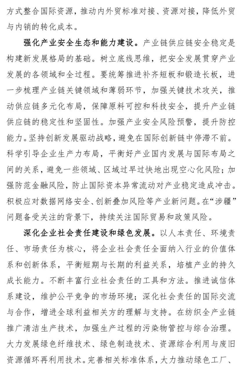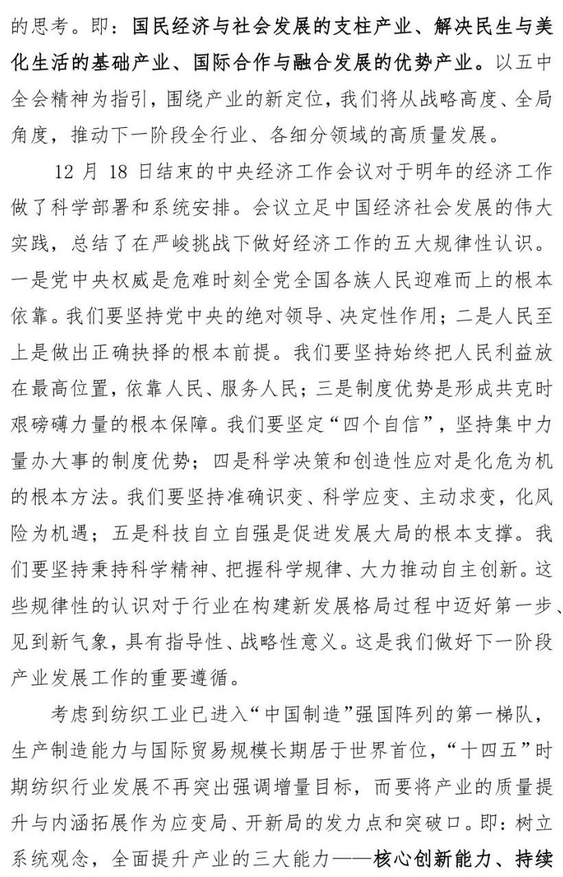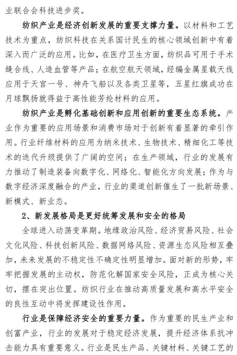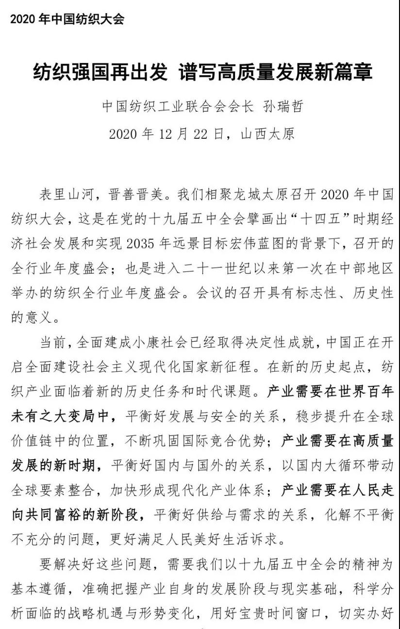 您现在的位置是:首页 > 要闻 孙瑞哲:纺织强国再出发,谱写高质量发展新篇章 来源:纺织服装周刊 发布日期:2020-12-28 字体: 【小】 【中】 【大】 12月22日,2020年中国纺织大会在山西太原隆重召开。中国纺织工业联合会会长孙瑞哲作了题为《纺织强国再出发 谱写高质量发展新篇章》的中国纺联工作报告。《纺织服装周刊》特将报告原文刊发于此,以飨读者。 分享: 热门文章: 2025intertextile春夏 | “友礼”同享齐观展... [2025-02-19] 2024年我国纺织行业经济运行总体平稳 [2025-02-17] 聚焦绿色智慧融合 展示产业用纺织品新趋势 [2025-02-11] 响应政策 落实服务 | PH Value义乌展全力“备战”中 [2025-02-11] 【亮星季】第一期正式开启 | 商贸先行,品质好礼享不停 [2025-02-10] 展会直通车