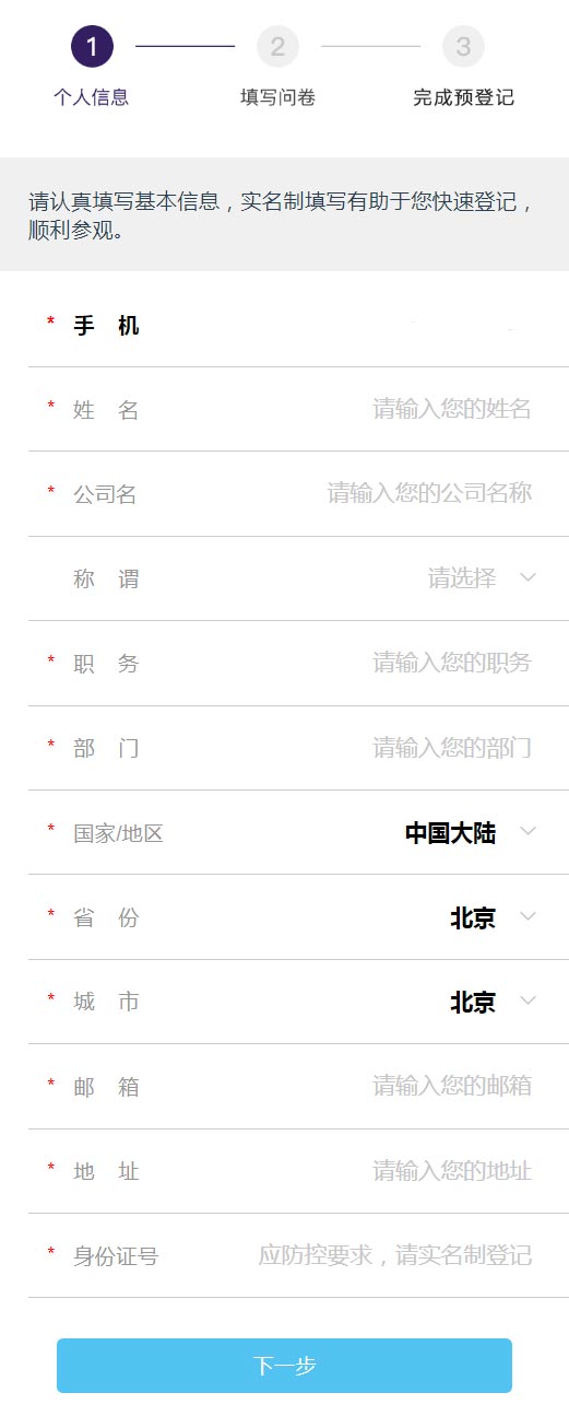 填写身份信息,并确保姓名与身份信息一致。根据国家、上海市以及展馆方防疫要求,为了保证所有参展商和观众的健康安全,CINTE21所有登记观众均需录入身份证号码,现场携带身份证原件实名入场参观。