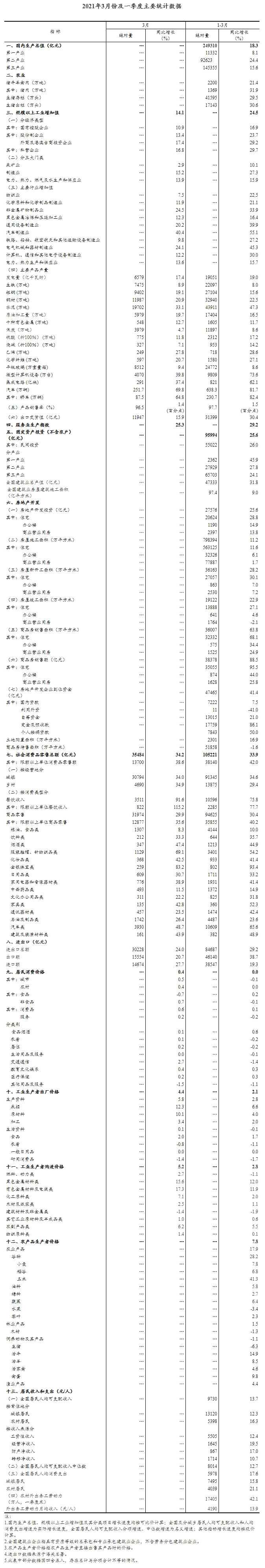 一季度,全国规模以上工业增加值同比增长24.5%,环比增长2.01%;两年平均增长6.8%。其中,3月份规模以上工业增加值同比增长14.1%;环比增长0.60%。分经济类型看,一季度国有控股企业增加值同比增长16.9%;股份制企业同比增长23.7%,外商及港澳台商投资企业同比增长29.2%;私营企业同比增长29.7%。分三大门类看,采矿业增加值同比增长10.1%,两年平均增长4.0%;制造业同比增长27.3%,两年平均增长6.9%;电力、热力、燃气及水生产和供应业同比增长15.9%,两年平均增长4.8%。装备制造业和高技术制造业增加值同比分别增长39.9%、31.2%,两年平均分别增长9.7%、12.3%。从产品产量看,新能源汽车,工业机器人,挖掘、铲土运输机械,微型计算机设备,集成电路同比增速均超过60%,两年平均增速均超过19%。3月份,中国制造业采购经理指数为51.9%,连续13个月高于临界点;企业生产经营活动预期指数为58.5%。