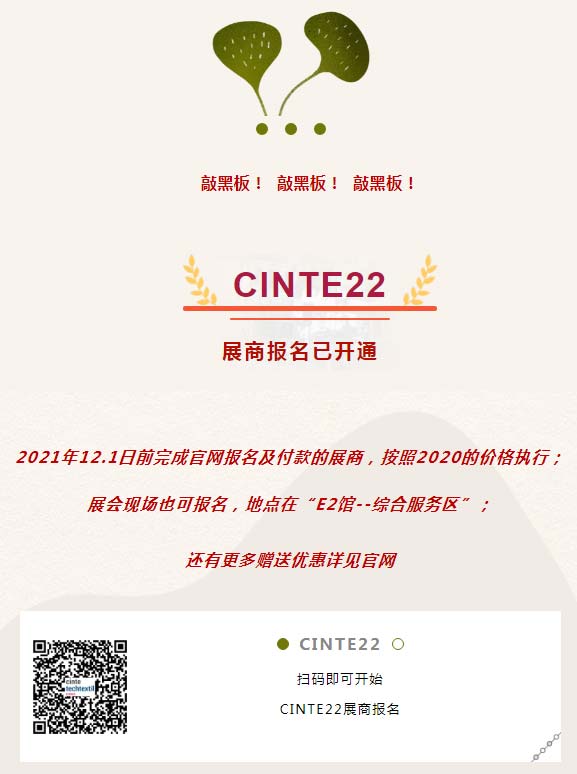 6月22-24日,CINTE21第十五届中国国际产业用纺织品及非织造布展览会将汇聚全球优势资源,促进产业链精准对接,为行业搭起最直观、最有效的采购对接平台。新产品、新技术、新模式、新趋势、新理念将在这里交汇,行业领军企业汇聚一堂,将顶层设计转化为市场应用的直观体现,全方位展示产业用纺织品在医疗卫生、安全防护、环境保护、基础设施建设、新能源、航空航天、国防军工等领域的重要作用,树立新时期行业高质量发展“风向标”。CINTE22展商报名已开通,早报还可享受早鸟价!详情可登录www.cinte.com.cn。