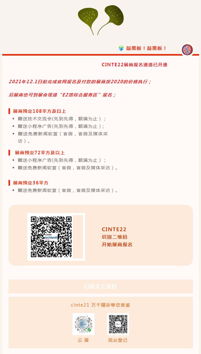 中国国际产业用纺织品及非织造布展览会为中国备受瞩目的产业用纺织品及非织造布展览会之一,个人防护产品、抗菌产品及产业用技术织物和非织造布同业者都汇聚于此。展会将于2021年6月22日至24日在上海新国际博览中心举行!作为德国法兰克福展览Techtextil展会在东亚的子展,展会将迎来国内的领先无纺布展商展示其各种产品。参观展会,亲身感受迅速发展的非织造布领域!