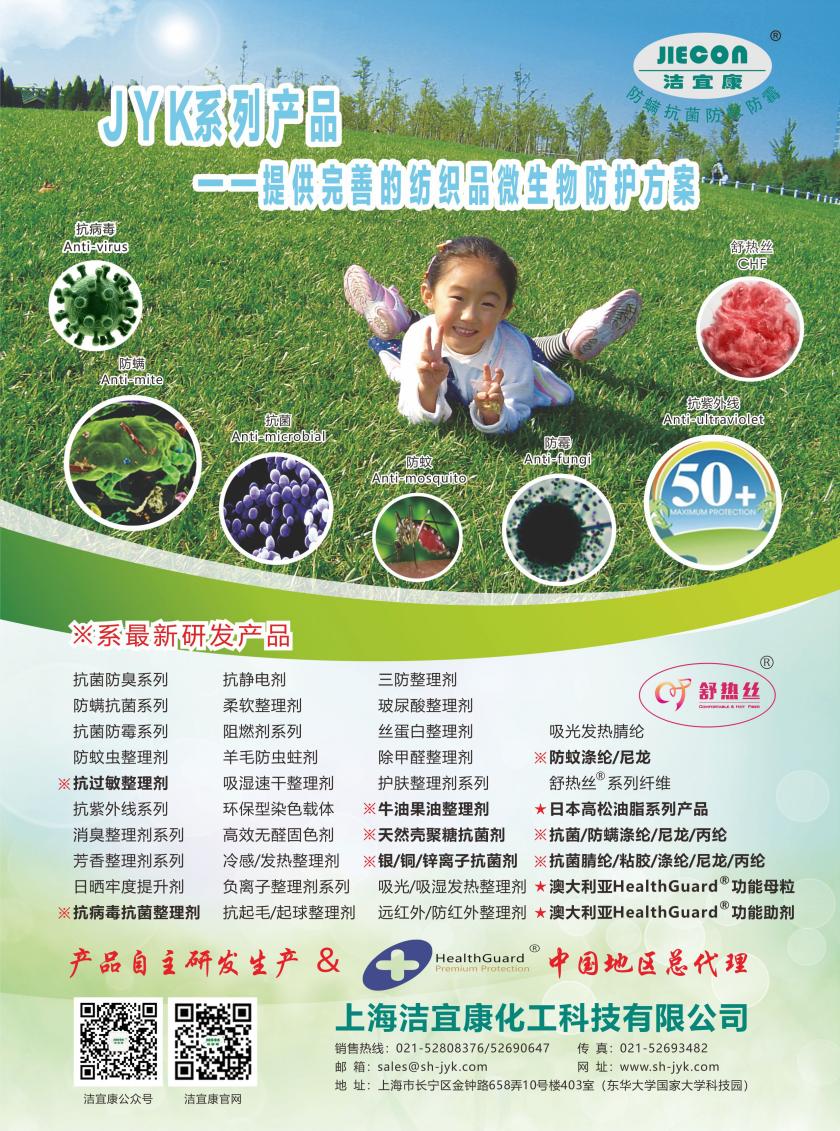 上海洁宜康自公司成立之初就坚持两个方向:一是功能性整理剂的研发,主要致力于纺织品的后整理;二是功能性纤维及纱线的开发,将一些高附加值功能内置于纤维中,更加有利于下游纺织企业的产品开发。16年来,公司已研制成功了抗菌防臭、防螨抗菌、抗菌防霉、防蚊、抗紫外线等多系列功能性整理剂和多种功能性纤维与纱线。