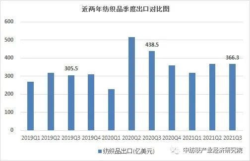 在防疫产品出口支撑作用明显下降的因素影响下,我国纺织品出口持续向疫情前回归。据我国海关数据显示,2021年1~9月,我国纺织品出口1051.8亿美元,同比下降10.7%。出口值虽然比去年同期低,但仍居于历史同期第二高点。