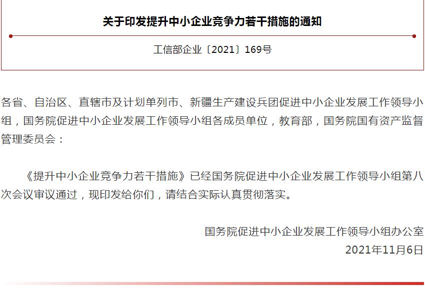 为贯彻落实党中央、国务院关于促进中小企业健康发展的决策部署,进一步激发中小企业创新活力和发展动力,提升中小企业竞争力,国务院促进中小企业发展工作领导小组办公室近日印发《提升中小企业竞争力若干措施》,从落实落细财税扶持政策,加大融资支持力度,加强创新创业支持,提升数字化发展水平,提升工业设计附加值,提升知识产权创造、运用、保护和管理能力,助力开拓国内外市场,提升绿色发展能力,提升质量和管理水平,提升人才队伍素质,加强服务体系建设等11个方面提出34条具体措施。
