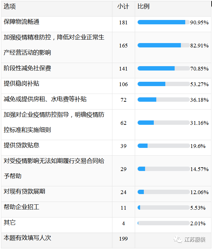 调查显示,在所有选项中,排在前五位的是:“保障物流畅通”、“加强疫情精准防控,降低对企业正常生产经营活动的影响”、“阶段性减免社保费”、“提供稳岗补贴”、“减免或提供房租、水电费等补贴”。