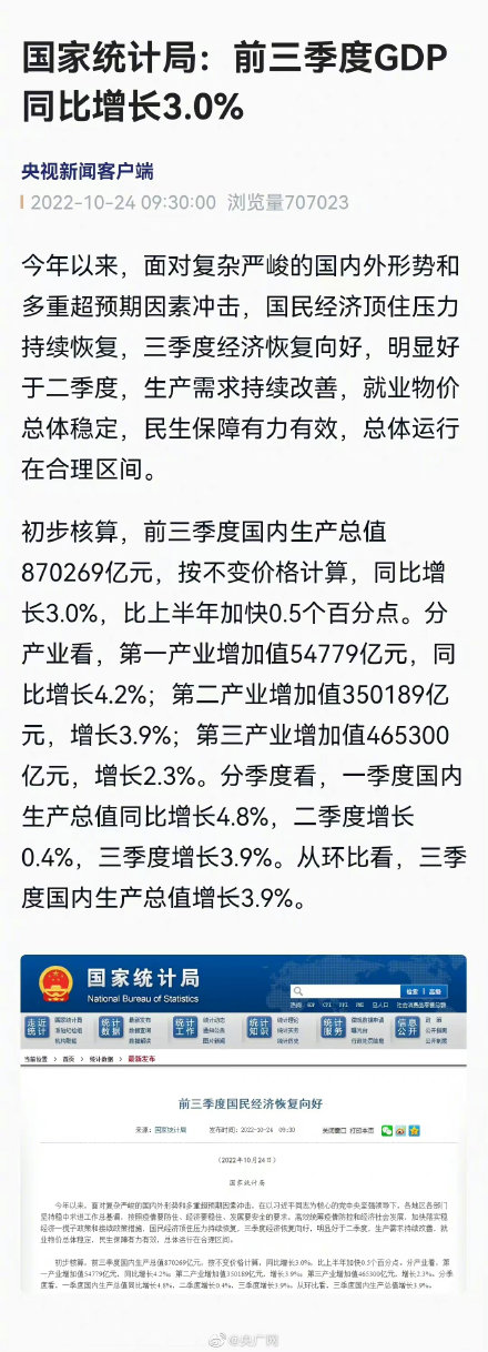 您现在的位置是:首页 > 要闻 国家统计局:2022年前三季度GDP同比增长3.0% 来源: 央广网 发布日期:2022-10-24 字体: 【小】 【中】 【大】 初步核算,前三季度国内生产总值870269亿元,按不变价格计算,同比增长3.0%,比上半年加快0.5个百分点。分产业看,第一产业增加值54779亿元,同比增长4.2%;第二产业增加值350189亿元,增长3.9%;第三产业增加值465300亿元,增长2.3%。分季度看,一季度国内生产总值同比增长4.8%,二季度增长0.4%,三季度增长3.9%。从环比看,三季度国内生产总值增长3.9%。 分享: 热门文章: 2025intertextile春夏 | “友礼”同享齐观展... [2025-02-19] 2024年我国纺织行业经济运行总体平稳 [2025-02-17] 聚焦绿色智慧融合 展示产业用纺织品新趋势 [2025-02-11] 响应政策 落实服务 | PH Value义乌展全力“备战”中 [2025-02-11] 【亮星季】第一期正式开启 | 商贸先行,品质好礼享不停 [2025-02-10] 展会直通车