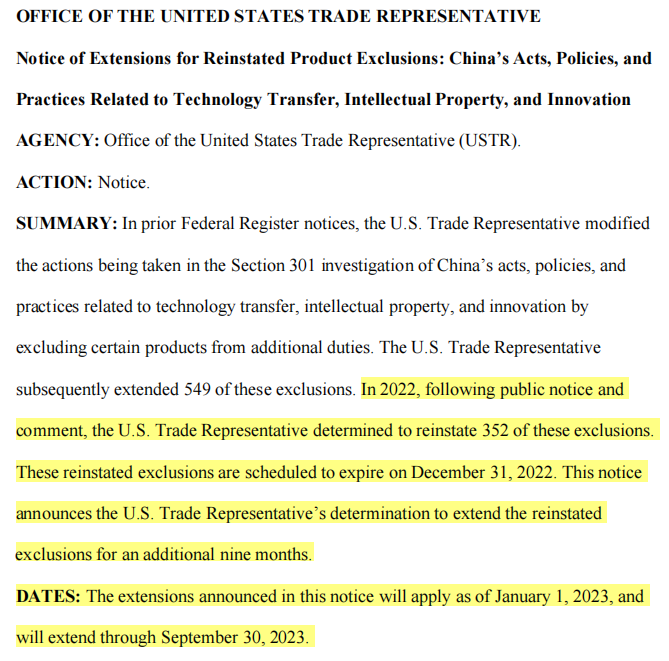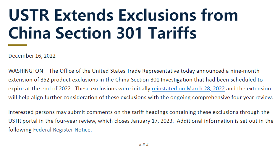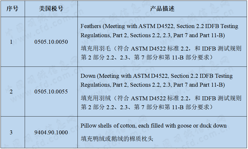 当地时间12月16日,美国贸易代表办公室(USTR)在官网发布公告,将2022年3月豁免关税的352项产品豁免期限从2022年底延长九个月,至2023年9月底,其中包括0505.10.0050填充用羽毛、0505.10.0055填充用羽绒和9404.90.1000填充鸭绒或鹅绒的棉质枕头三项产品(具体见下表)。