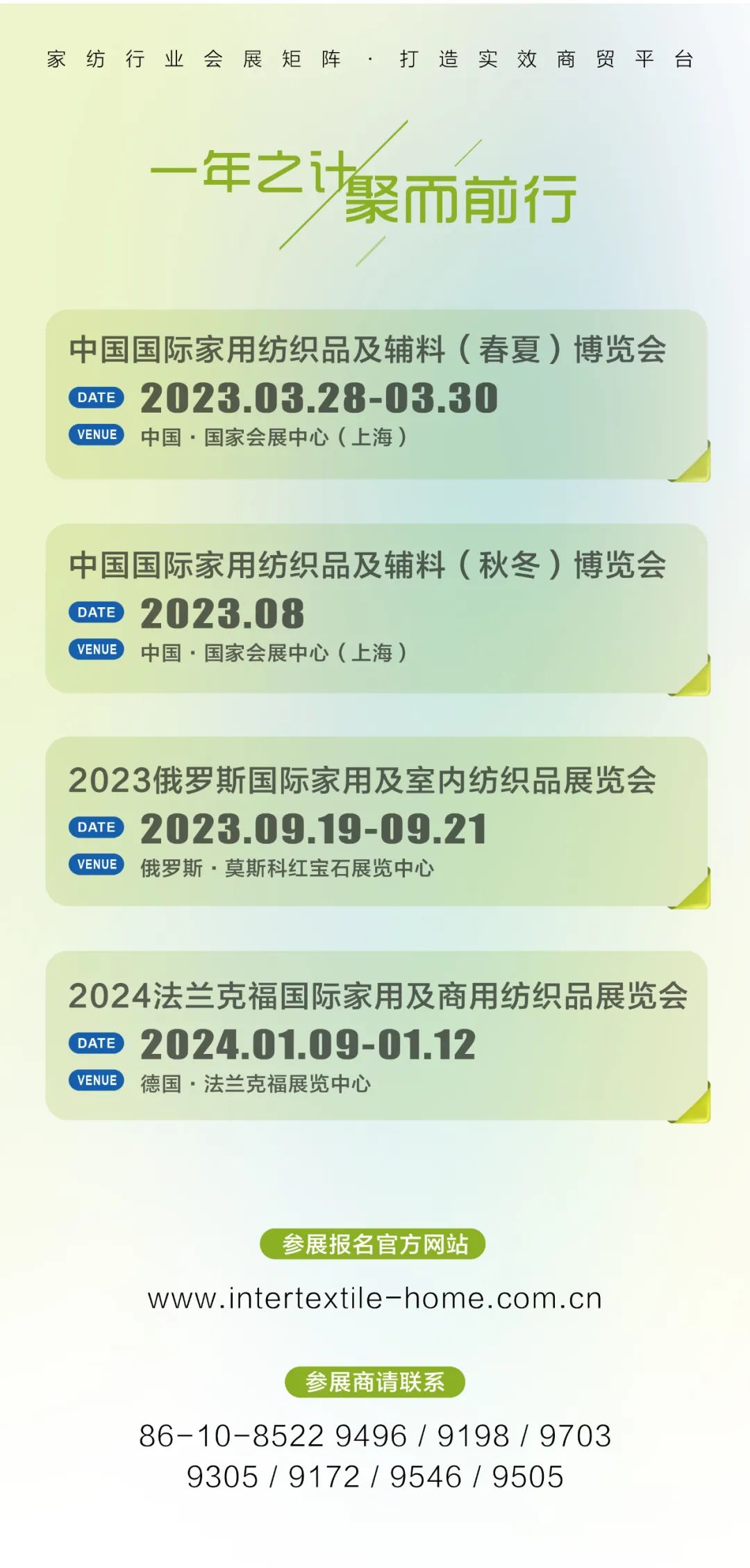 待中国纺联春季联展大幕开启,2023intertextile春夏家纺展必将汇聚全产业发展要素,充分发挥渠道优势、客户优势和资源整合优势,帮助家纺上下游企业,重新打开发展渠道,催生商贸机遇,传递生活主张,激活家纺人2023的“一年之计”。