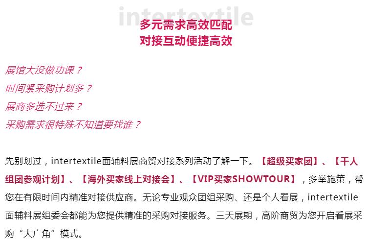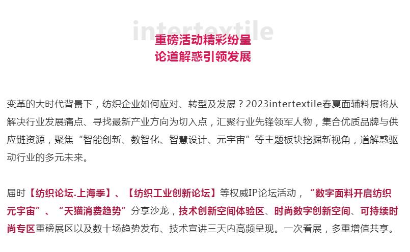 新年伊始,“铆足干劲来”、“力争兔年开门红”,行业企业纷纷摩拳擦掌、拼劲十足。近期,小编们不停被电话、邮件、小红书账号、微信后台多渠道的专业观众“轮番询问轰炸”,也充分感受到了大家对2023intertextile春夏面辅料展期待值已经拉满!