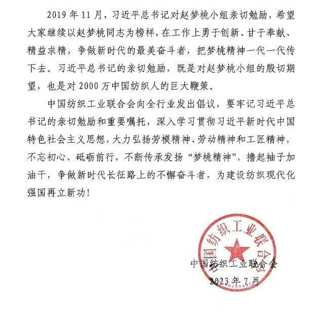 中国纺织工业联合会向全行业发出倡议,要牢记习近平总书记的亲切勉励和重要嘱托,深入学习贯彻习近平新时代中国特色社会主义思想,大力弘扬劳模精神、劳动精神和工匠精神,不忘初心、砥砺前行,不断传承发扬“梦桃精神”,撸起袖子加油干,争做新时代长征路上的不懈奋斗者,为建设纺织现代化强国再立新功!