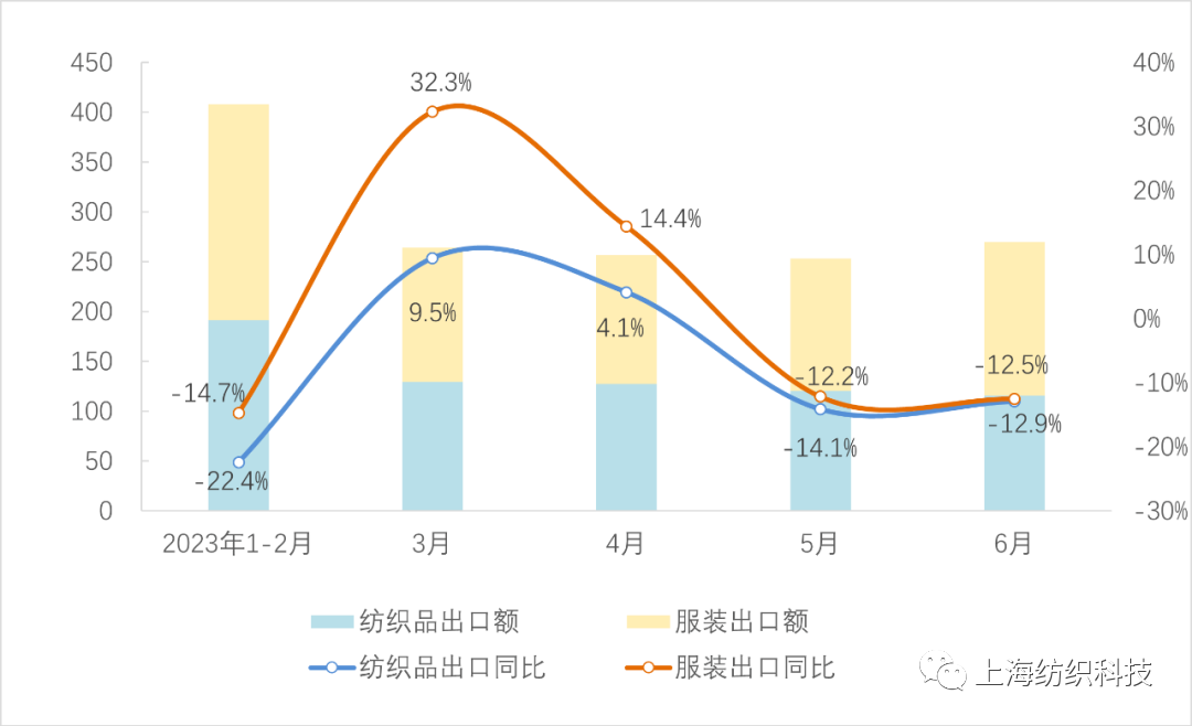 图1:2023年全国纺织品、服装出口月度统计 (金额:亿美元)