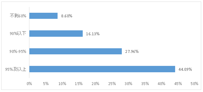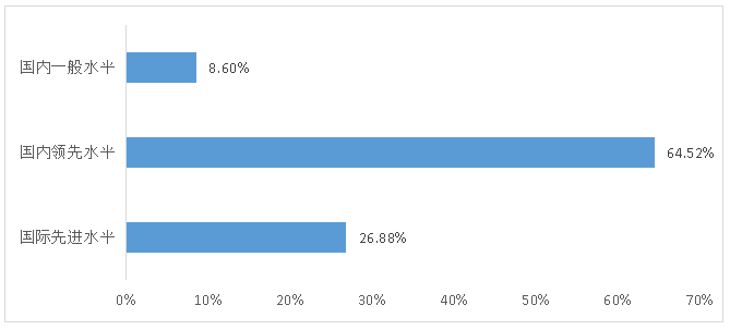 1. 当前行业整体生产技术及装备水平较高。根据问卷调查反馈情况,64.52%的样本企业认为其当前生产技术及装备水平处于国内领先水平,26.88%的样本企业认为其当前生产技术及装备水平处于国际先进水平,仅有8.60%的样本企业认为其当前生产技术及装备水平处于国内一般水平(图6)。