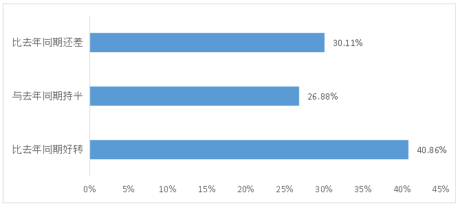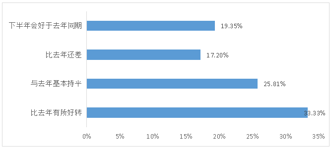 2. 企业对纺织化纤产业链复苏的信心有待加强。调研问卷显示,对于2023年1-4月的市场情况,有40.86%的企业认为较去年同期有所好转,26.88%的企业认为与去年同期持平,但还有30.11%的企业认为比去年同期还差(图4);对于2023年全年的化纤市场行情,仅有33.33%的企业预期化纤全年市场运行较去年同期有所好转,仅有19.35%的企业预期下半年市场运行较去年同期有所好转(图5)。